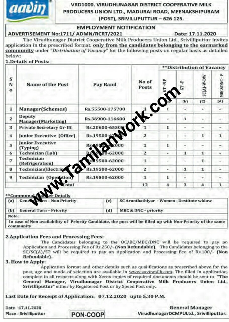 Aavin Virudhunagar Recruitment 2020 Inspiring 12 Various Posts