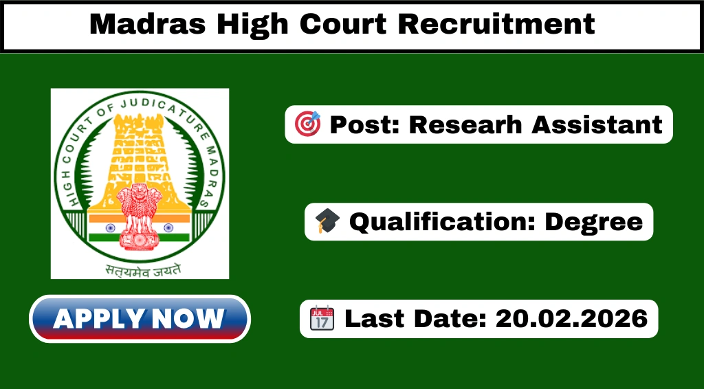 Madras High Court Recruitment 2026: Madras High Court has announced for Research Assistant, Research Fellow posts. Eligible candidates can apply online from January 9th, 2026 to February 20th, 2026. The offline application form is available on the official Madras High Court website: www.mhc.tn.gov.in. Selected candidates will be employed at Madras High Court ,Chennai.