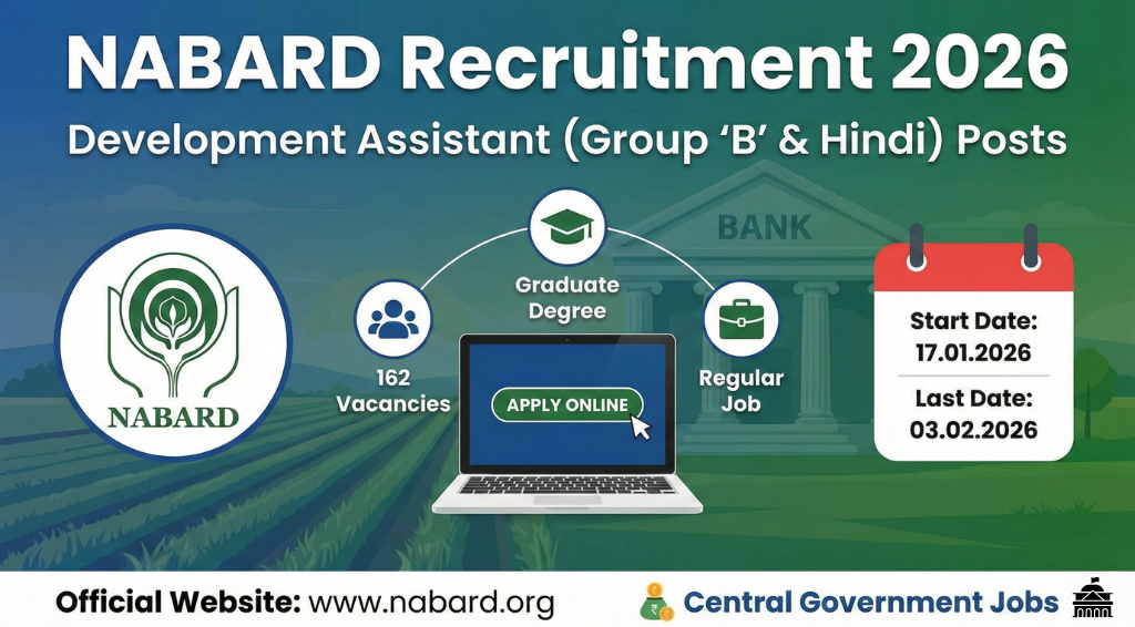 National Bank for Agriculture and Rural Development (NABARD) has released a recruitment notification to fill Development Assistant (Group ‘B’) and Development Assistant (Hindi) posts on a regular basis. Eligible candidates can apply online from 17 January 2026 to 03 February 2026 through the official NABARD website www.nabard.org.