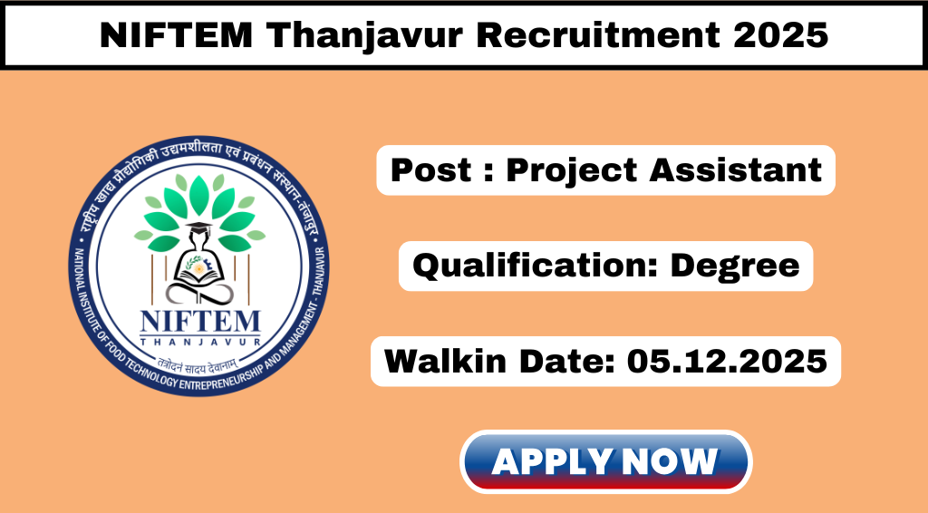NIFTEM Thanjavur Recruitment 2025: National Institute of Food Technology, Entrepreneurship & Management, Thanjavur has announced for recruitment of Senior Research Fellow (SRF), Project Assistant posts on contract basis. Eligible candidates can attend interview on December 5th, 2025. The Official Notication is available on the National Institute Of Food Technology, Entrepreneurship & Management website: www.niftem-t.ac.in.Selected candidates will be employed at NIFTEM, Thanjavur.