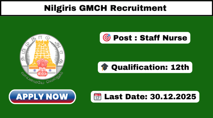 Nilgiris GMCH Recruitment 2025: Nilgiris Government Medical College and Hospital has recently announced the latest recruitment for Staff Nurse, Laboratory Technician posts on temporary basis. Eligible candidates can apply offline on December 23th, 2025 to December 30th, 2025. The candidates can download offline notification Pdf is available on the official Nilgiris Government Medical College and Hospital website:www.Nilgiris.nic.in. Selected candidates will be employed at Government Medical College Hospital, Udhagamandalam – Nilgiris.